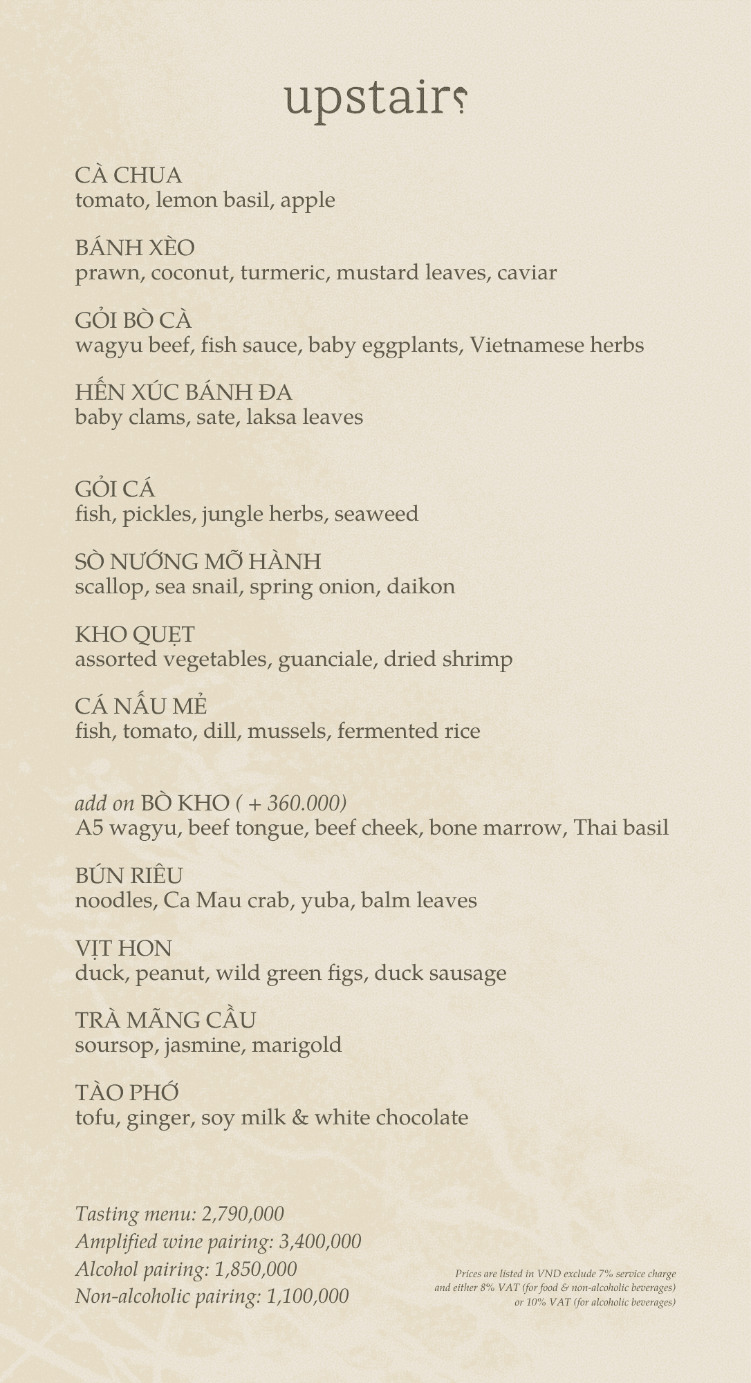 At Upstairs Tasting Room, we appreciate the diverse local ingredients and cuisine inspiration. We offer a tasting menu that reconnects with our roots through modern techniques and creates a sophisticated yet welcoming atmosphere here for you.